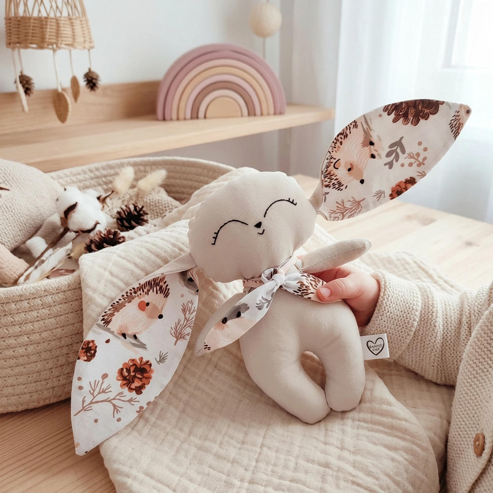 Bézs nyuszkó, aranyos sünis fülekkel és hozzá illő sállal.