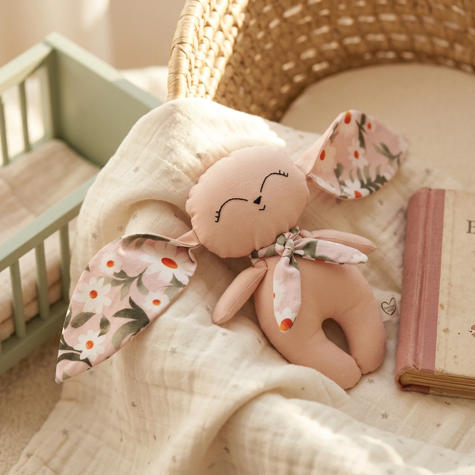 Barack nyuszkó, margarétás fülekkel és hozzá illő sállal.