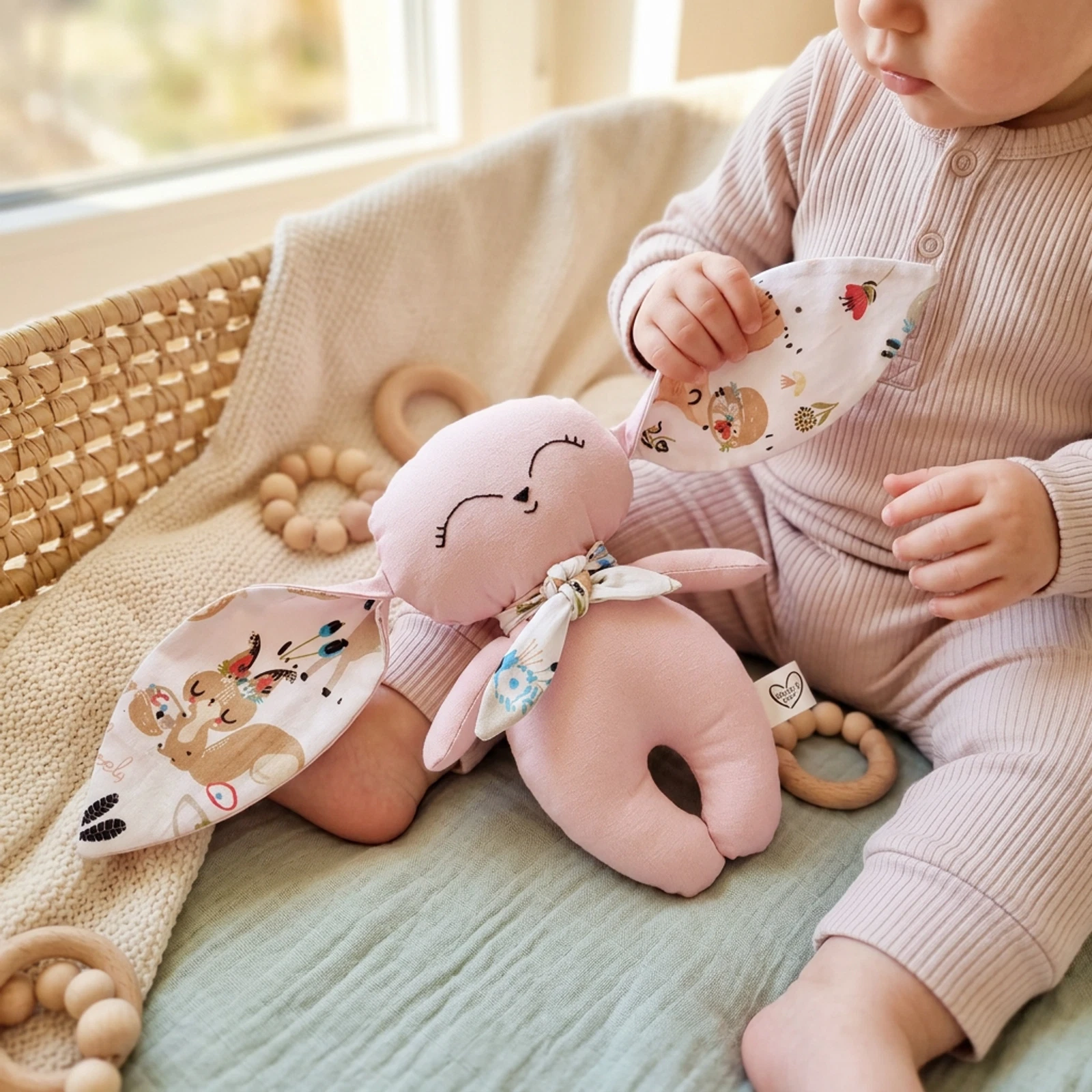 Rózsaszín nyuszkó, erdei állatkás fülekkel és hozzá illő sállal.