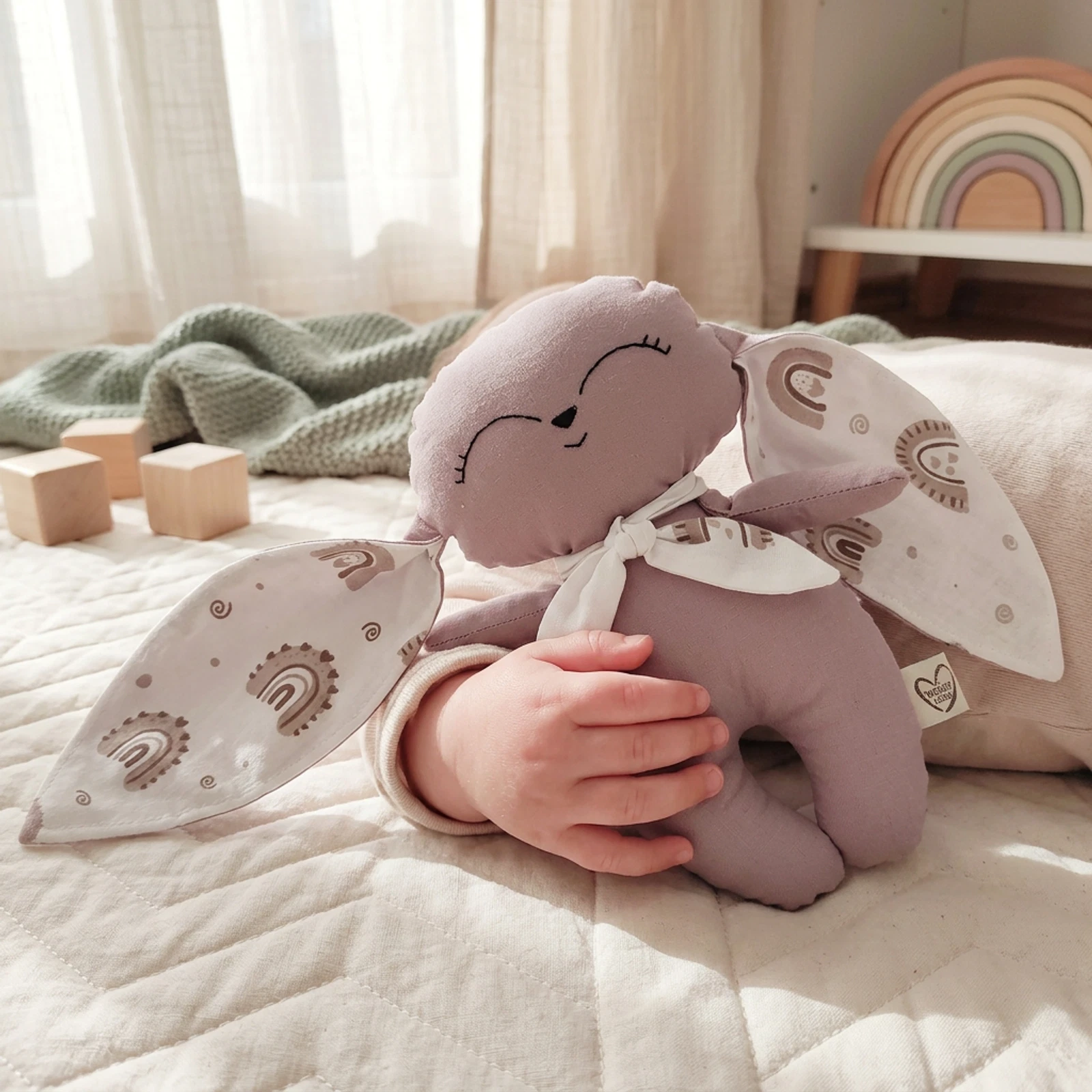 Csokoládé barna nyuszkó, fehér alapon barna szivárványos fülekkel és hozzá illő sállal.