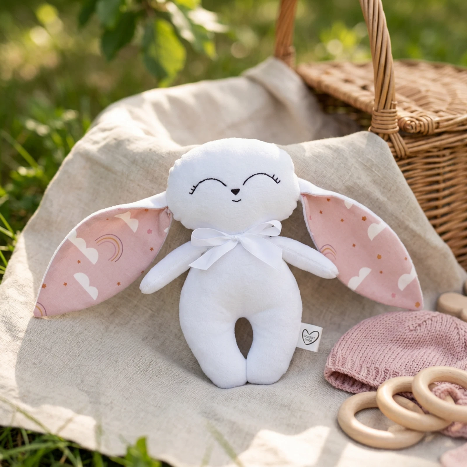 Fehér nyuszkó, rózsaszín alapon felhős fülekkel és fehér masnival.