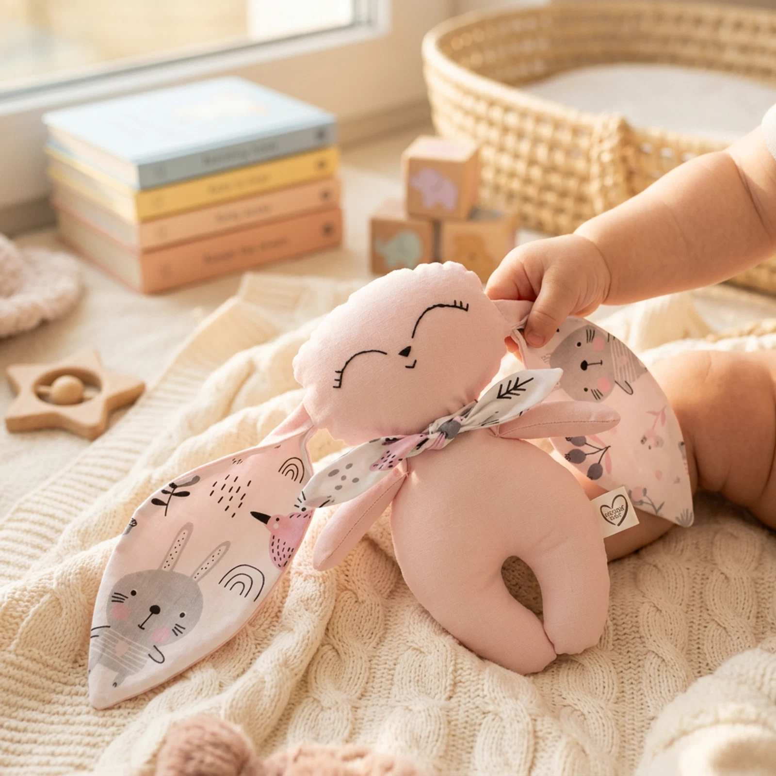 Rózsaszín nyuszkó, rózsaszín erdei állatkás fülekkel és hozzá illő sállal.