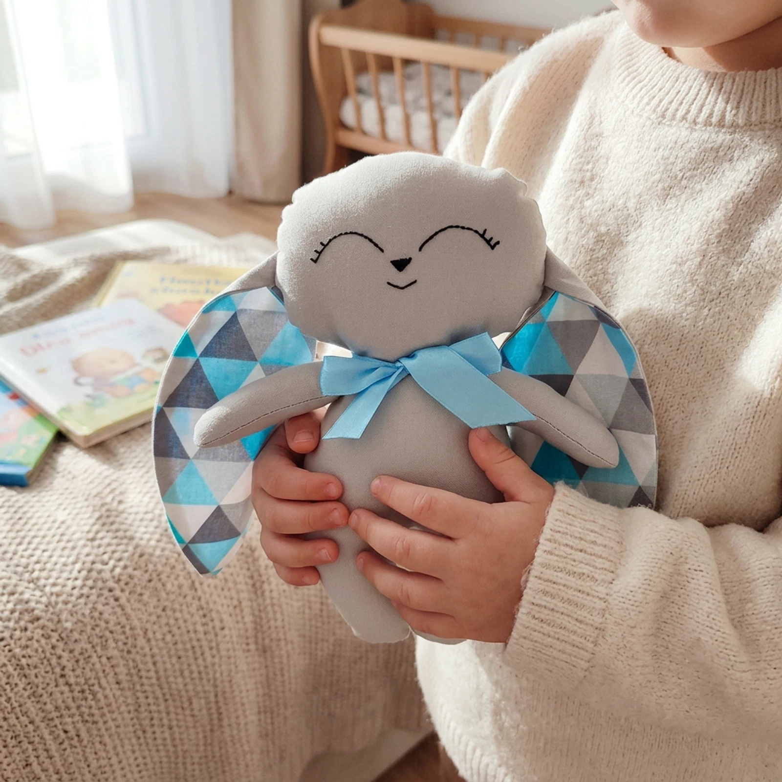 Szürke nyuszkó, szürke-kék háromszöges fülekkel és kék masnival.