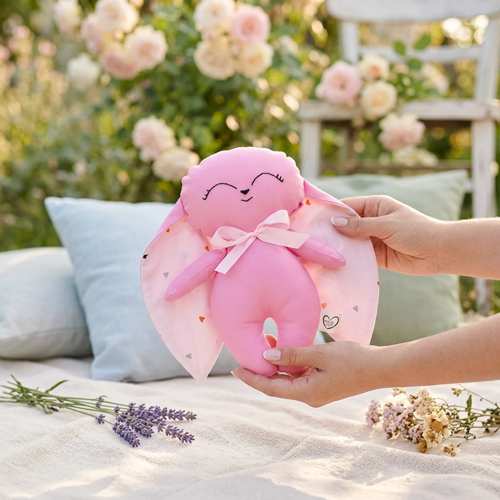 Pink nyuszkó, fehér alapon színes szívecskés fülekkel és fehér masnival.