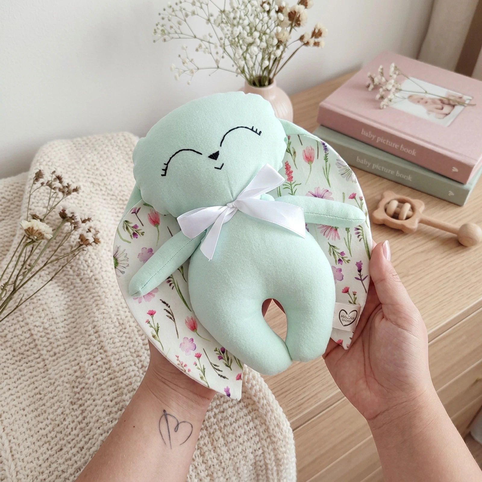 Halvány zöld nyuszkó, virágos mezős fülekkel és fehér masnival.