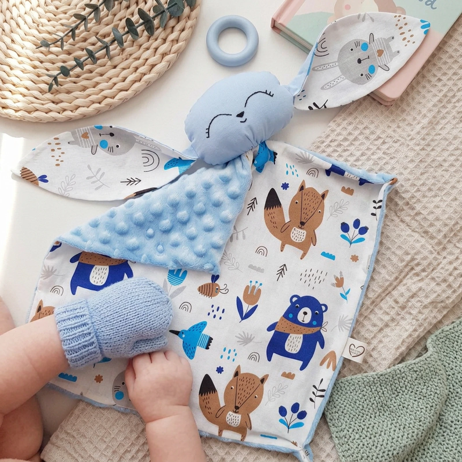 Kék erdei állatkás szundikendő, pihe-puha kék minky plüss hátoldallal.