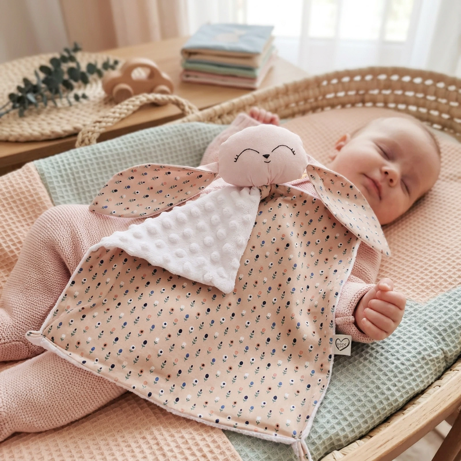 Barna alapon apró virágos szundikendő, rózsaszín minky plüss hátoldallal.