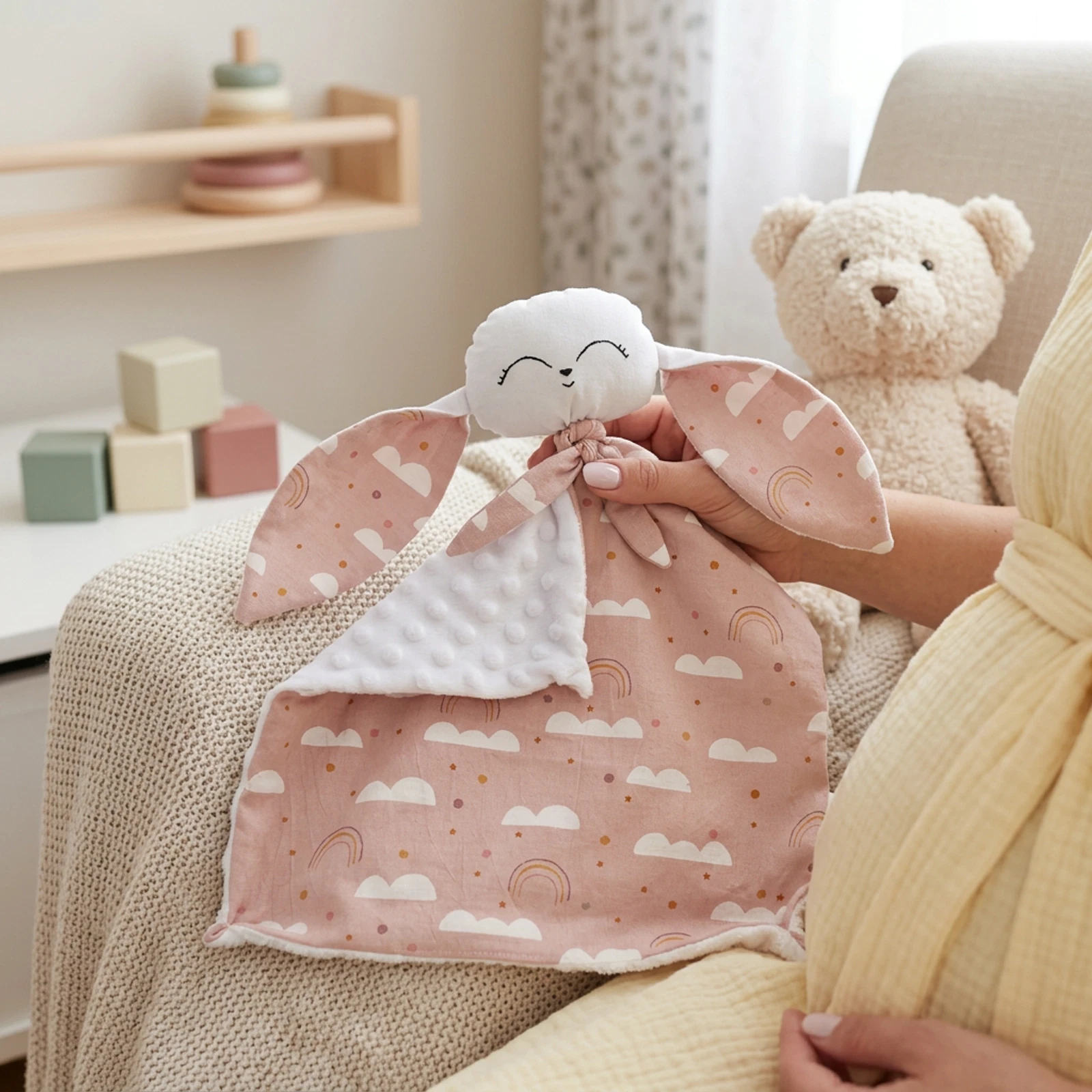 Pasztell alapon felhős szundikendő, fehér minky plüss hátoldallal.