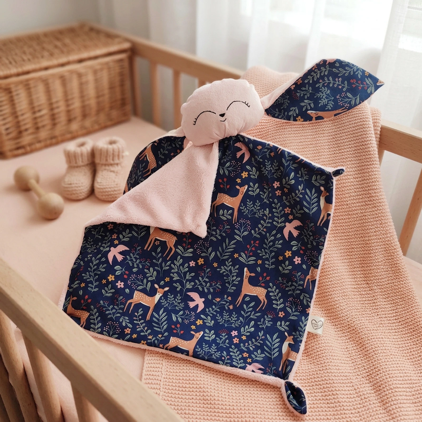 Sötétkék alapon őzikés szundikendő, pihe-puha rózsaszín baby wellsoft hátoldallal.