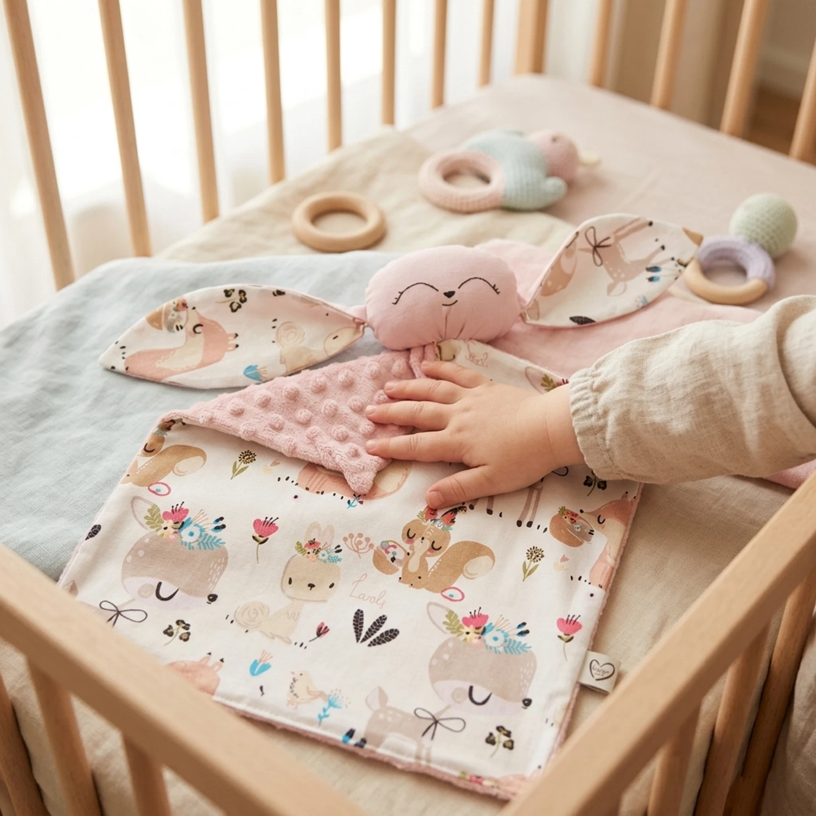 Rózsaszín erdei állatkás szundikendő, rózsaszín minky plüss hátoldallal.