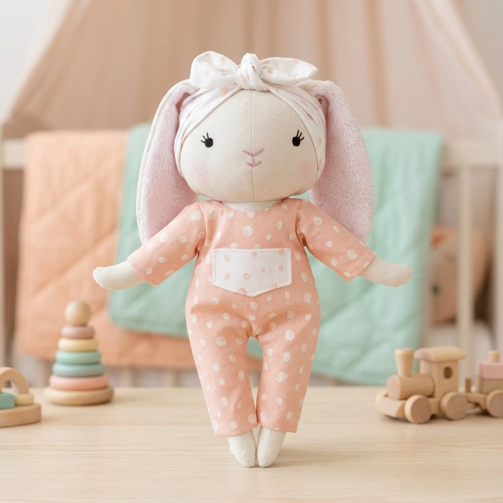 Öltöztethető nyuszi baba, barack alapon pöttyös zsebes overálban, a szetthez illő megkötős fejpántban.
