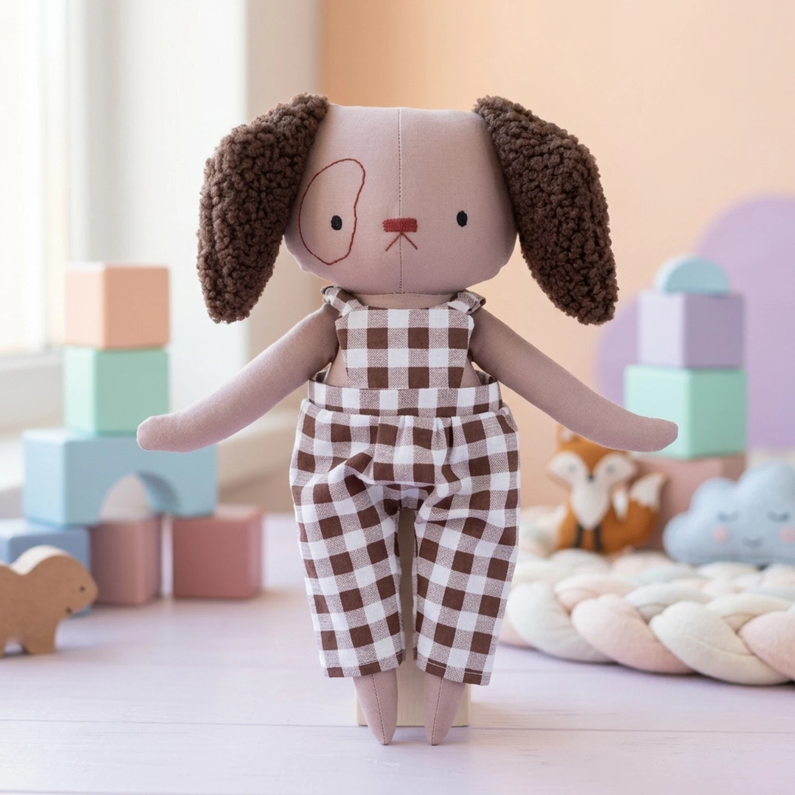 Öltöztethető kutya baba, barna-fehér kockás overálban és sötétbarna teddy fülekkel.