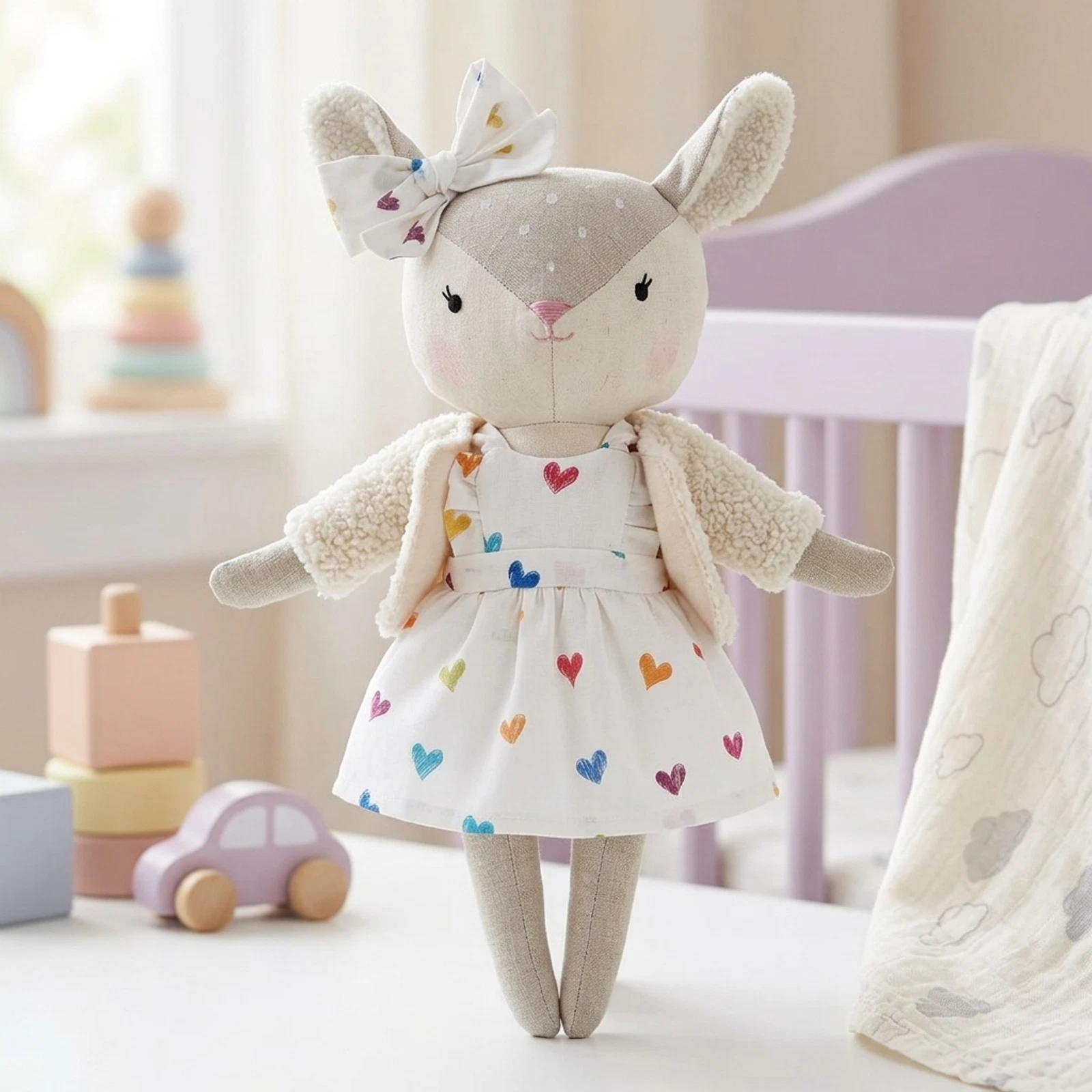 Öltöztethető őzike baba, színes szivecskés fodros ujjú ruhában, a szetthez illő csatos masnival. Ajándék teddy kabátka jár a babához!