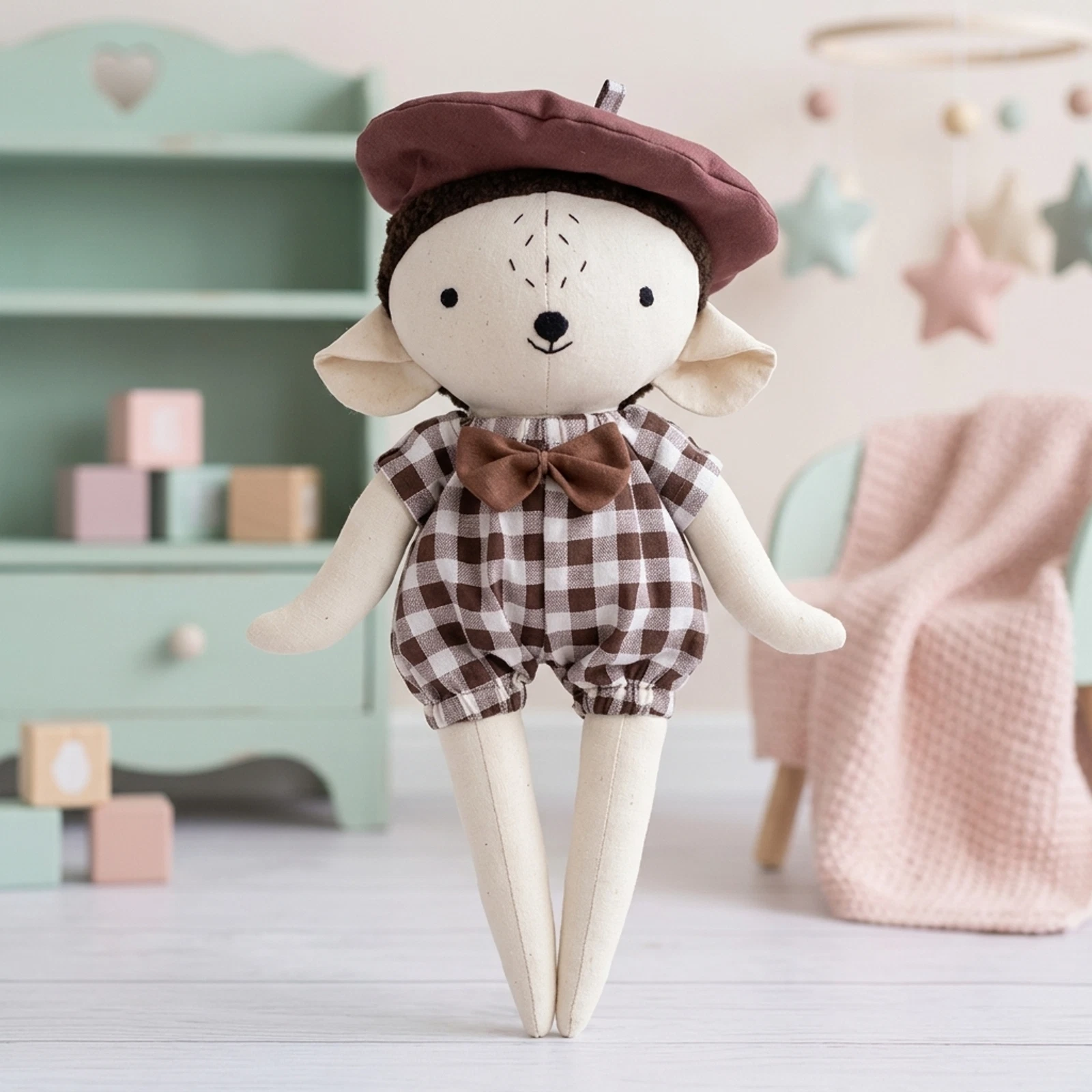 Öltöztethető süni baba, barna-fehér kockás gumírozott római overálban, masnival a nyakában. Aranyos francia stílusú sapit is kapott, barna színben.