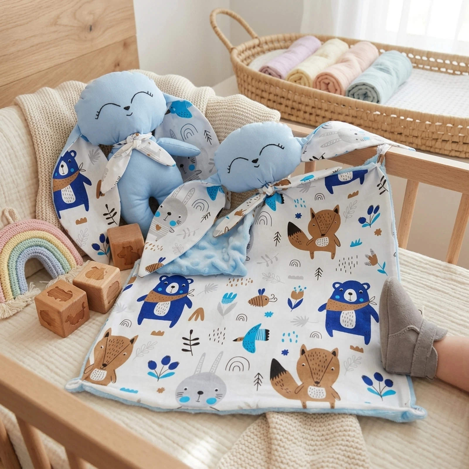Kék nyuszkó, erdei állatkás fülekkel és sállal. Erdei állatkás szundikendő, kék minky hátoldallal.
