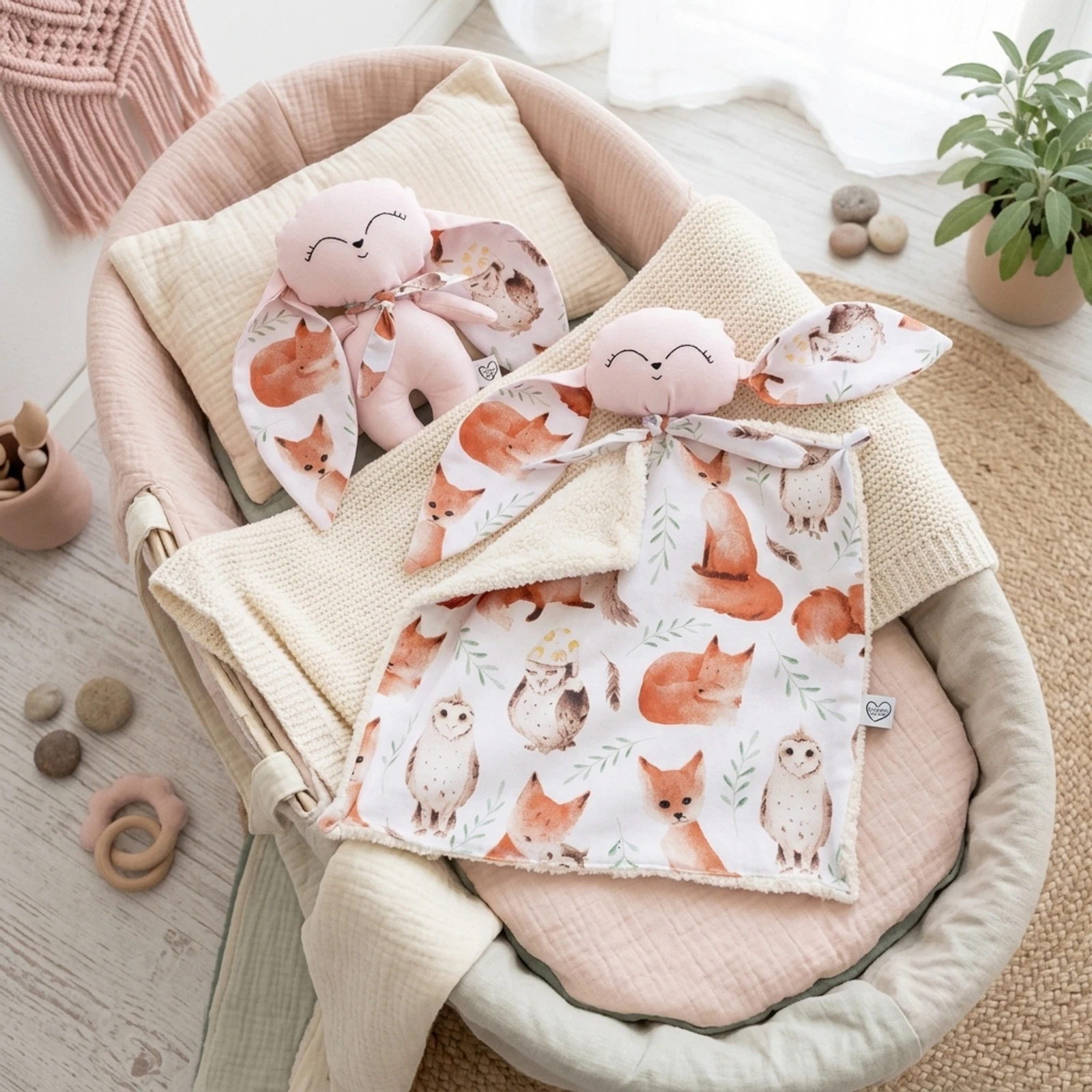 A készlet része egy 25 cm-es, 100% pamutvászonból készült nyuszi figura is, amely szintén kézzel hímzett vonásokkal teszi teljessé a szettet. A babák számára biztonságos, antiallergén töltettel készült, így nyugodtan lehet vele aludni és játszani.