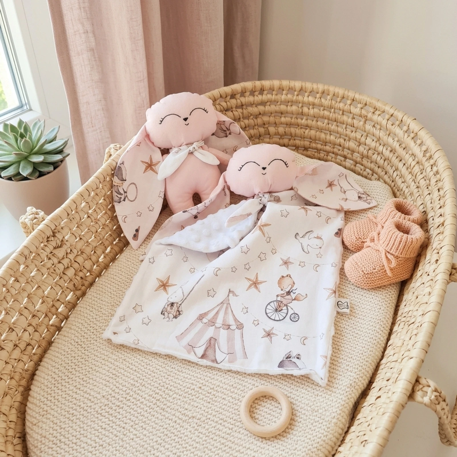A készlet része egy 25 cm-es, 100% pamutvászonból készült nyuszi figura is, amely szintén kézzel hímzett vonásokkal teszi teljessé a szettet. A babák számára biztonságos, antiallergén töltettel készült, így nyugodtan lehet vele aludni és játszani.