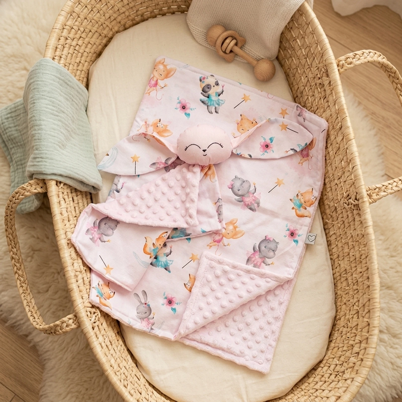 Varázsold még meghittebbé a babaszobát ezzel a bájos minky babatakaró és nyuszkó szundikendő szettel. Ez a prémium minőségű párosítás tökéletes választás a legkisebbek számára, hiszen minden darabja gondos odafigyeléssel készült. A 100x70 cm-es babatakaró egyik oldala pihe-puha, ölelni való minky plüss, a másik oldala pedig kiváló minőségű, mintás pamutvászon. Az Oeko-Tex I. minősítés garantálja, hogy az anyagok teljesen bababarátok és biztonságosak. A takaró ideális meleget biztosít, így a pihenés minden perce felhőtlen lesz. A szett elmaradhatatlan része a 30x30 cm-es nyuszkó szundikendő, amely a nyugodt alvás hű társa lesz. A kendő egyik fele prémium pamutvászon, a másik oldala pedig selymesen puha minky anyagból készült. A nyuszi fejecskéje antiallergén szilikonizált poliészter golyókkal töltött, arcocskája pedig kézzel hímzett, így minden darab egyedi és szerethető. A szett tisztítása egyszerű: mosógépben 30 fokon, mosózsák használatával tisztítható. Kérjük, ügyelj rá, hogy a szárítógép használatát mellőzd, a minky plüss anyagot pedig ne vasald. Szeretnéd még különlegesebbé tenni ezt a csodás ajándékot? Válaszd a kézzel hímzett névre szóló opciót, amivel igazán személyessé varázsolhatod a babaváró vagy születésnapi meglepetést. Szerezz örömet ezzel a pihe-puha szettel, amely nemcsak praktikus, de a babaszoba ékköve is lesz.